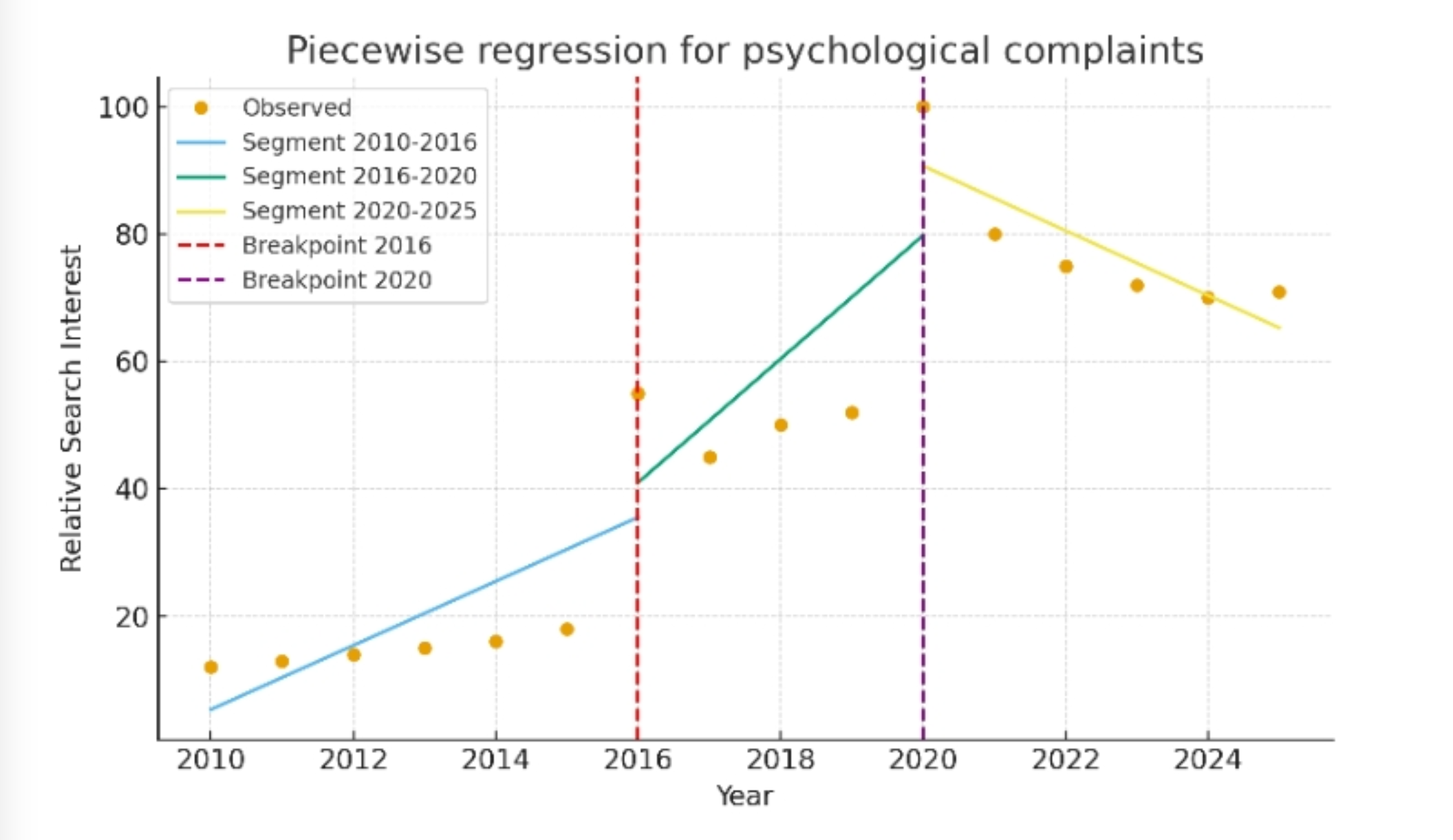 Figure 13: Best-fitting piecewise linear model for psychological complaints with breakpoints at 2016 and 2020.