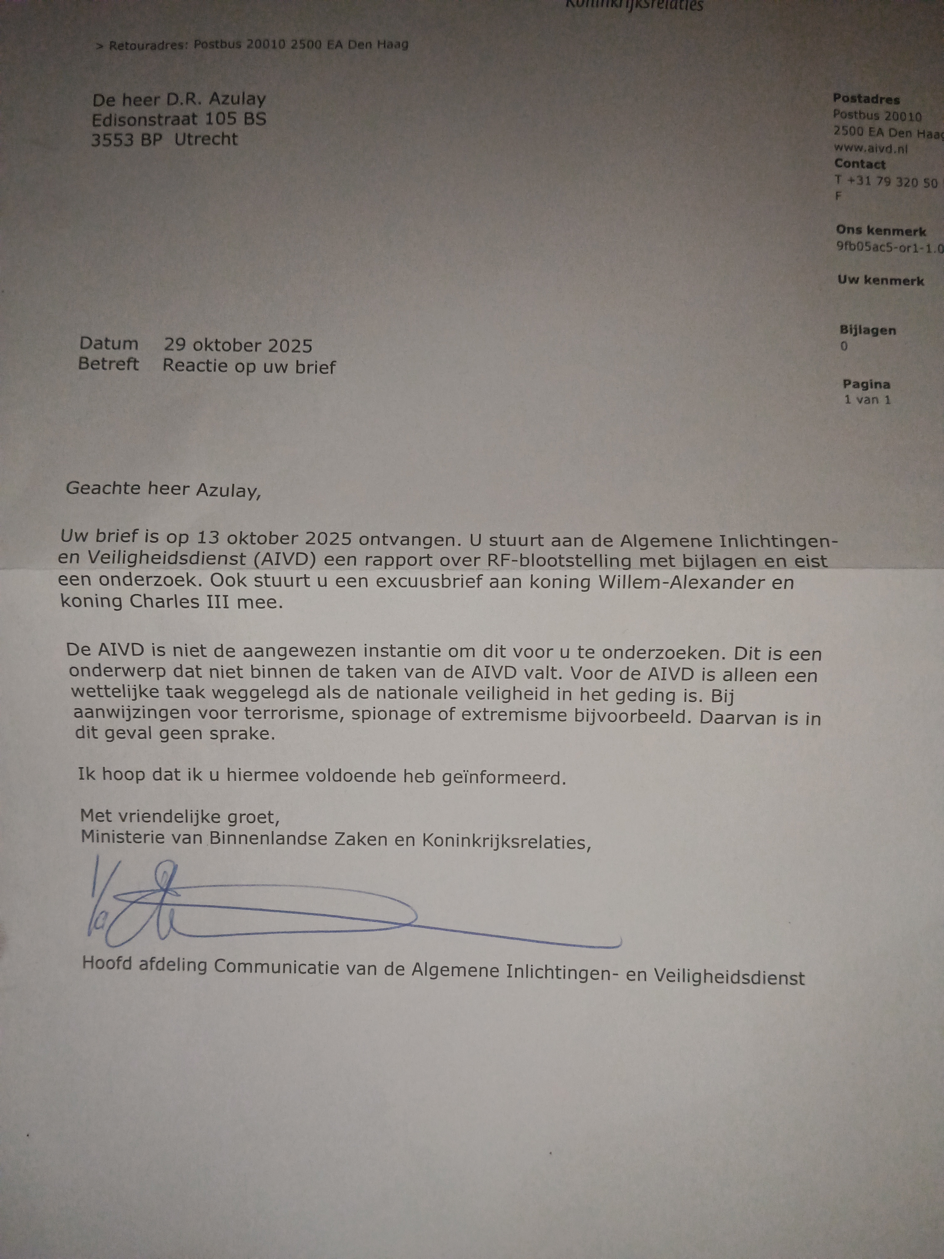 The only entity with both the technical capability and the obvious motive to perform such a precise postal hijack is the AIVD itself. A Woo request submitted on 4 November 2025 to the Ministry of Justice and Security—intended to force disclosure of any interception order—was itself obstructed in ways that further implicating the service. Under the Wiv 2017 the interception is plainly unlawful: I am a private citizen with no criminal record and an officially empty prior file; the AIVD had already reviewed identical material and declared it irrelevant; and blocking a citizen’s protected report to the police violates necessity, proportionality, and the service’s own mandate to safeguard the democratic legal order.