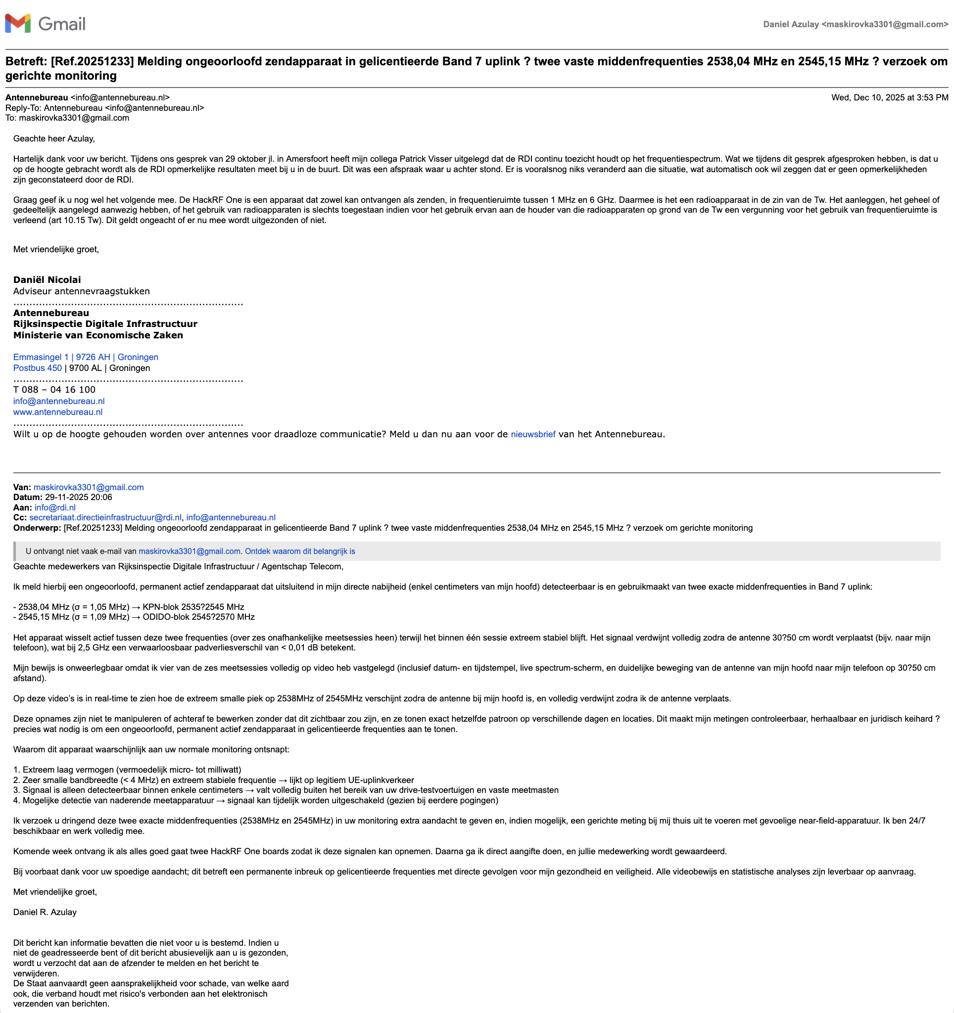 Today I received the long-awaited reply from Daniël Nicolai (Antennebureau / Rijksinspectie Digitale Infrastructuur) regarding my formal report [Ref.20251233] of an illegal, permanent, head-proximal transmitter operating on approximately 2538, 2545 and 2553 MHz — three razor-sharp carriers inside the licensed Band 7 uplink blocks of KPN and ODIDO.