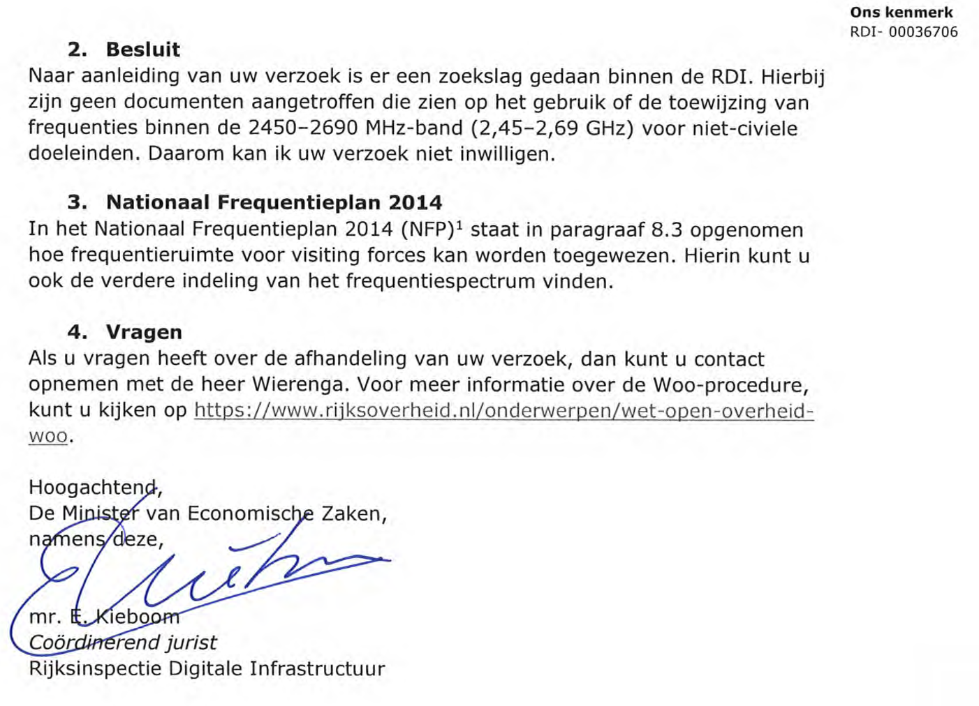 Today the Rijksinspectie Digitale Infrastructuur (RDI) dropped this gem: a flat denial of my Woo-verzoek from 2 November 2025. I asked for documents on non-civil (military/NATO) use of the 2450–2690 MHz band since 2008 — the exact range where my forensic logs show persistent, head-localised carriers at 2538 MHz, 2545 MHz and 2553 MHz tied to years of directed-energy harassment.